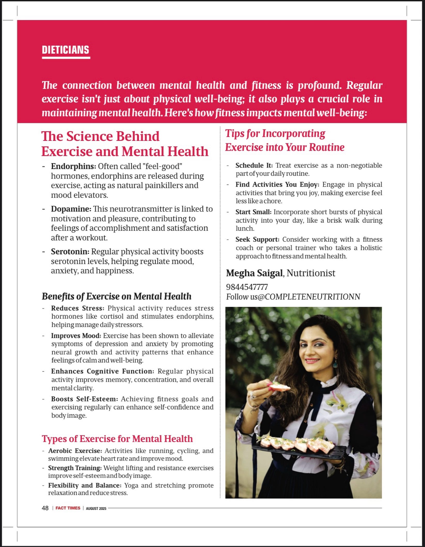 Her first flavour, “Hangover Tea,” was followed by blends like Hibiscus Tea, Joint Pain Tea, Anxiety Tea, and Sleep Tea. Each was carefully designed with wellness in mind. A client of hers from Punjab, who was apparently leading a magazine called “FACT TIMES”, was impressed with the results he experienced from the nutrition plan from Megha, and he requested her to write articles every month about nutrition and diet in his magazine and the proof is below.